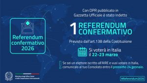 Con decreto del Presidente della Repubblica del 13/01/2026, pubblicato nella Gazzetta Ufficiale del 14/01/2026, è stata fissata nei giorni 22 e 23 MARZO 2026 la data del referendum ex art. 138 della Costituzione per la modifica di alcuni articoli della Costituzione (c.d. “Riforma della giustizia”).